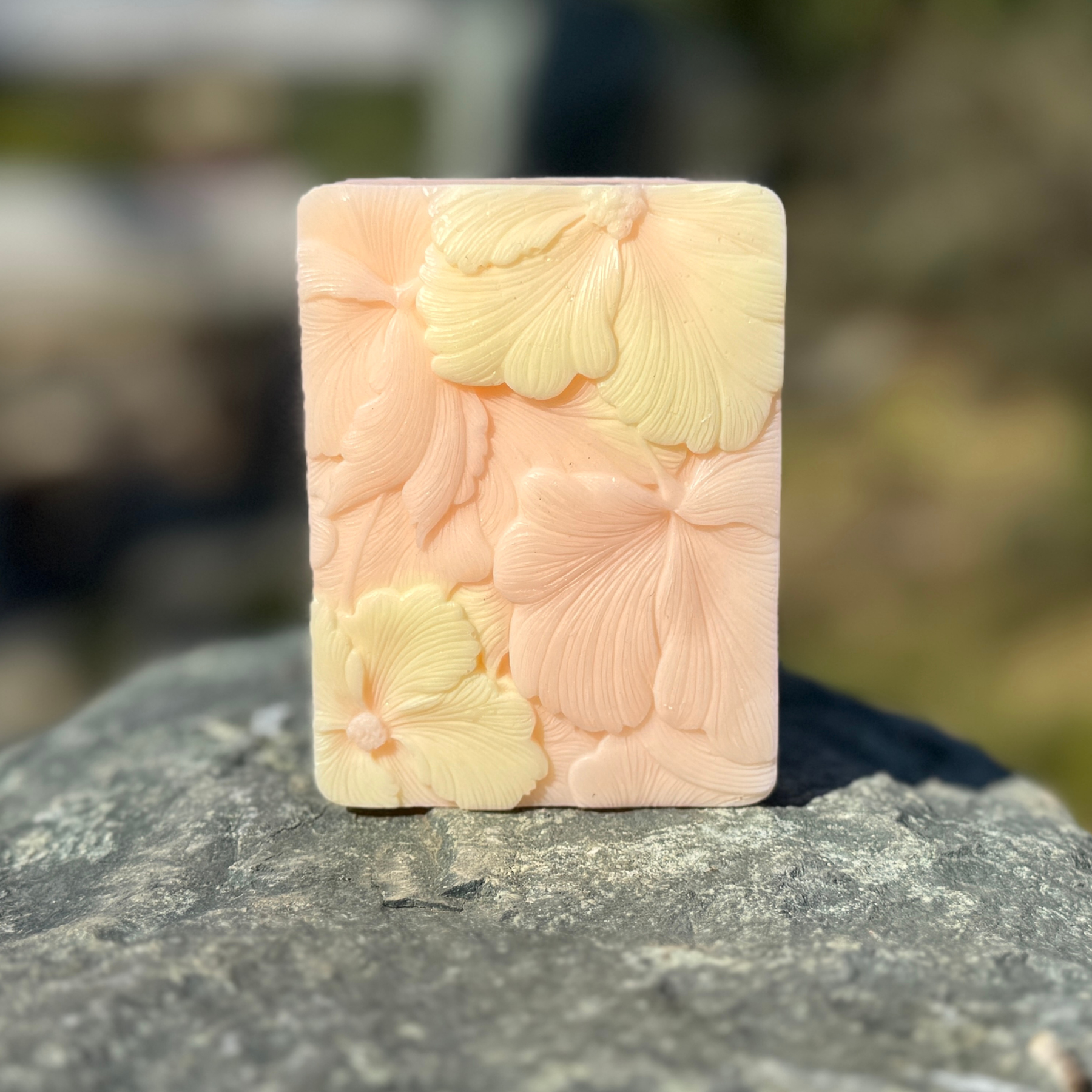 The body of the soap is a soft, sunlit orange — warm and inviting — accented with delicate buttery yellow flowers blooming throughout. The cheerful color palette reflects the fragrance itself: bright, radiant, and full of life. Each bar looks like a slice of golden sunshine, bringing a fresh, uplifting touch to your sink or shower while capturing the essence of citrus blossoms in full bloom.